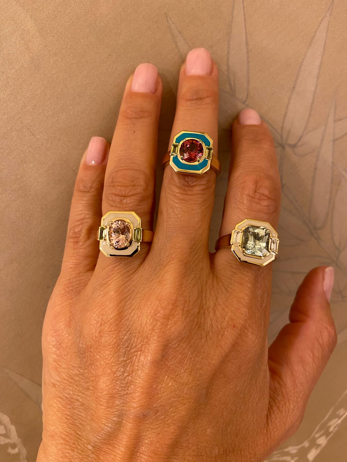 At the heart of this ring glows a captivating 1.9 ct emerald cut natural Morganite. Hand-crafted in 14k yellow gold, this design is enhanced with bone-colored enamel, and two sleek baguette peridots adding brilliance, sparkle. It is indeed refine, graceful and unforgatable.